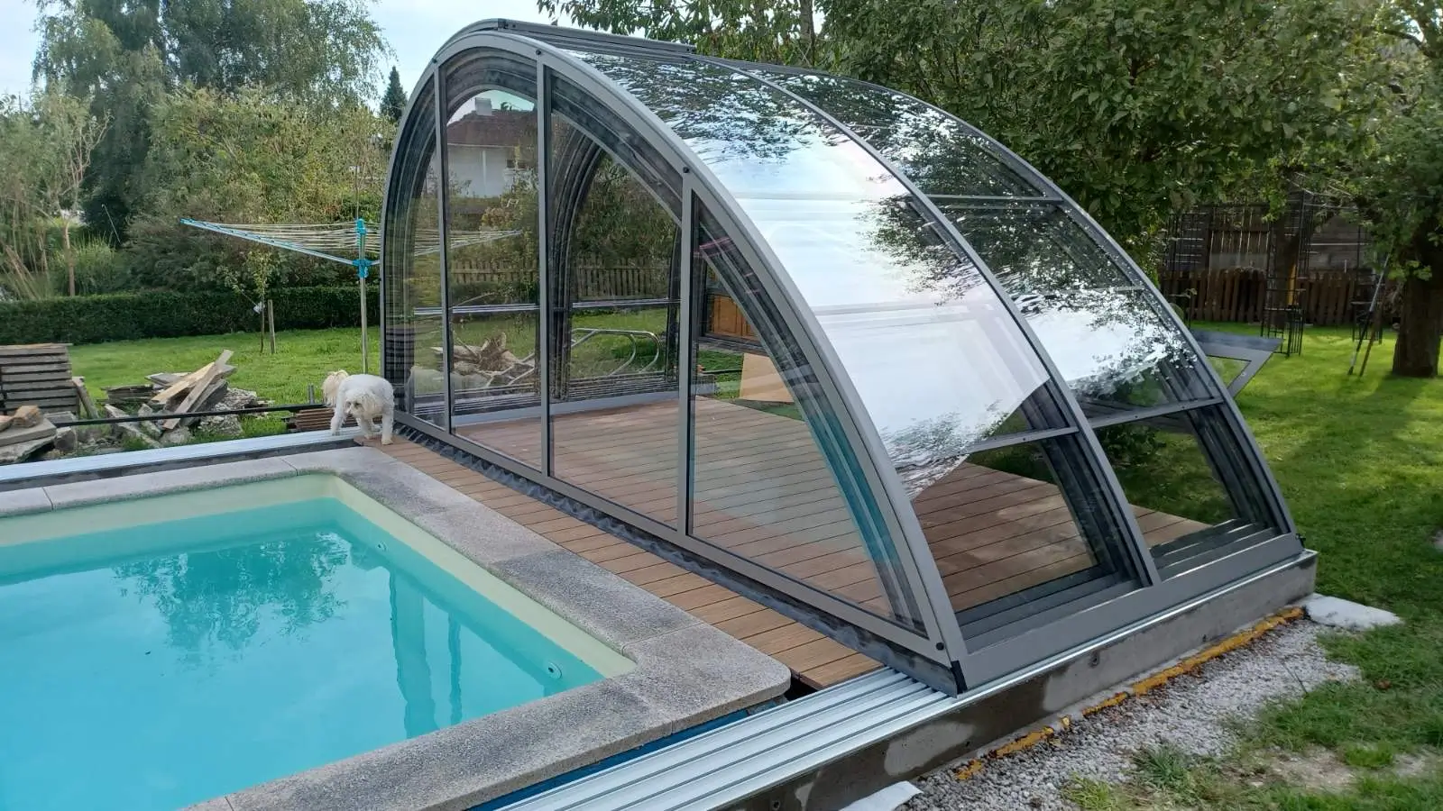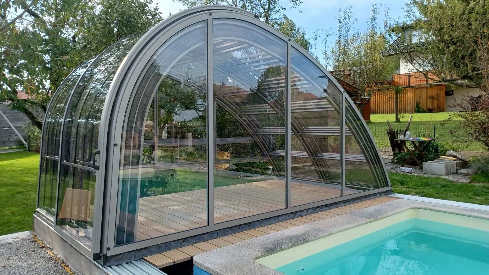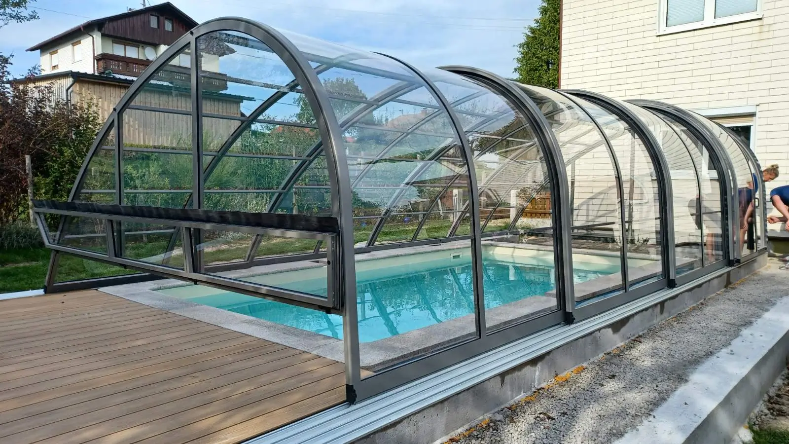 A hétköznapi használat során az Oasis egyfajta kerti élettérré válik, ahol a part menti szabad mozgásnak semmi nem szab határt. A merőleges sík mentén kialakuló tágas térben kényelmesen elhelyezhetők a pihenőbútorok vagy a kerti kiegészítők, így a fürdőzés élménye a vízparti relaxációval válik teljessé. A csendesen gördülő, professzionális sínrendszer lehetővé teszi a szegmensek könnyed átrendezését, így a medencetér pillanatok alatt alkalmazkodik az aktuális igényekhez. Ezt a megoldást olyan tulajdonosoknak fejlesztettük ki, akik a medencére aktív rekreációs zónaként tekintenek, ahol a családi események és a sportolás egyetlen védett, tágas helyszínen valósulhat meg, az időjárási körülményektől teljesen függetlenül.
