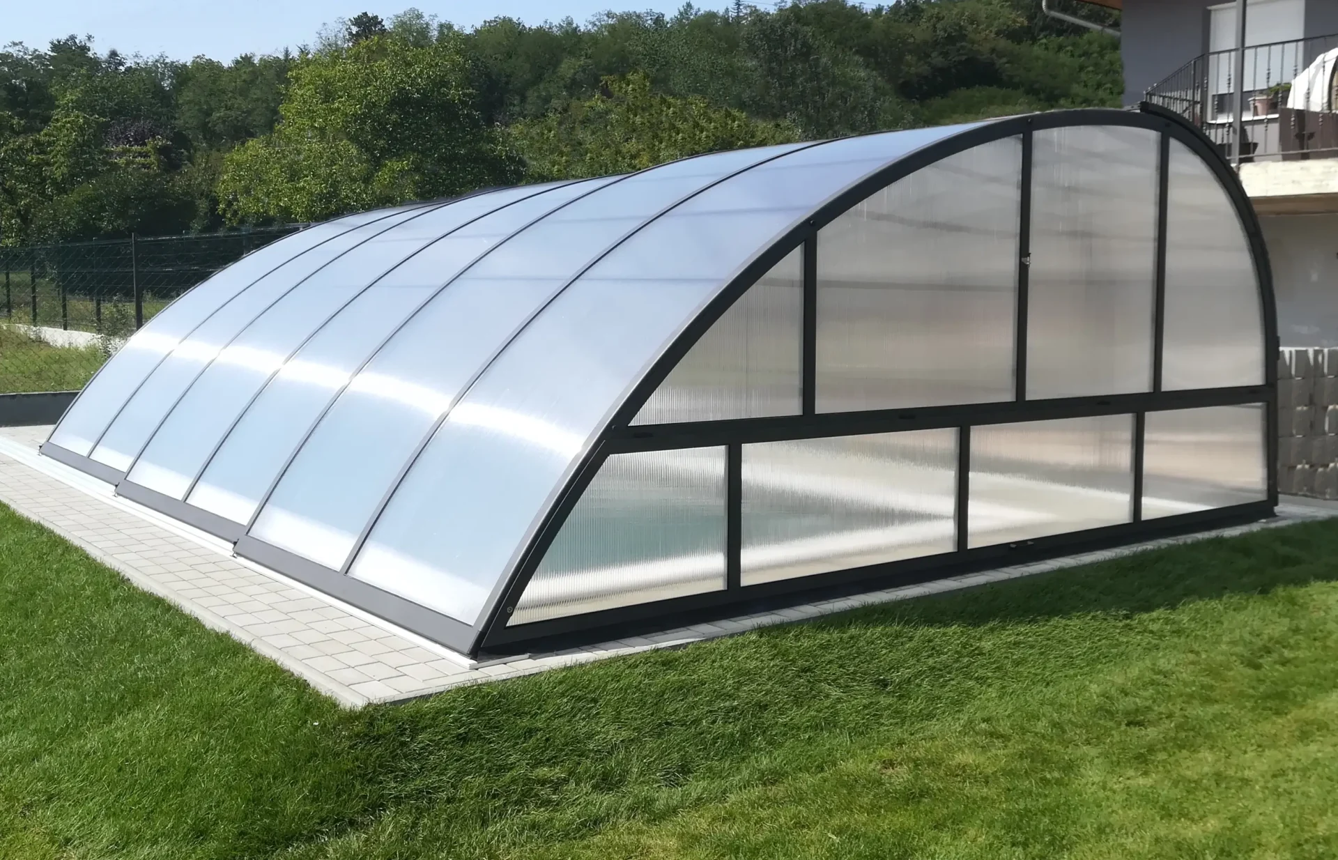 A medencefedés karakterét az Ön által választott üvegezés adja meg. Ebben a modellben szabadon dönthet a prioritásokról: a tömör, víztiszta polikarbonát üvegszerű tisztaságot és modern esztétikát kínál, míg a cellás szerkezetű panelek a kiemelkedő hőszigetelésre és a privát szféra védelmére összpontosítanak.