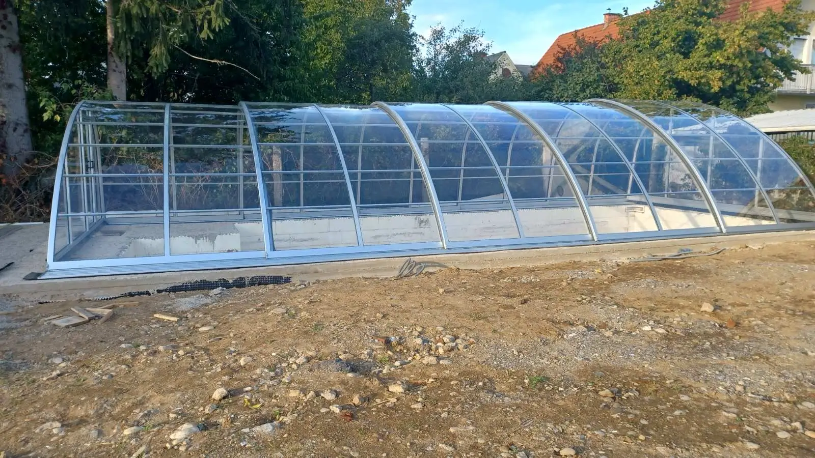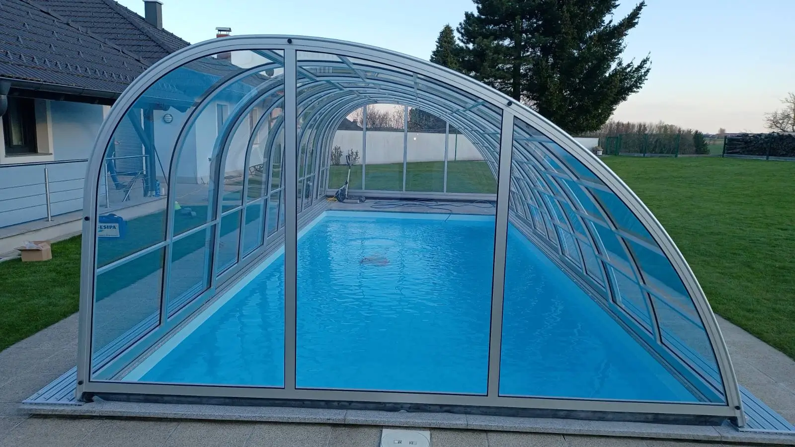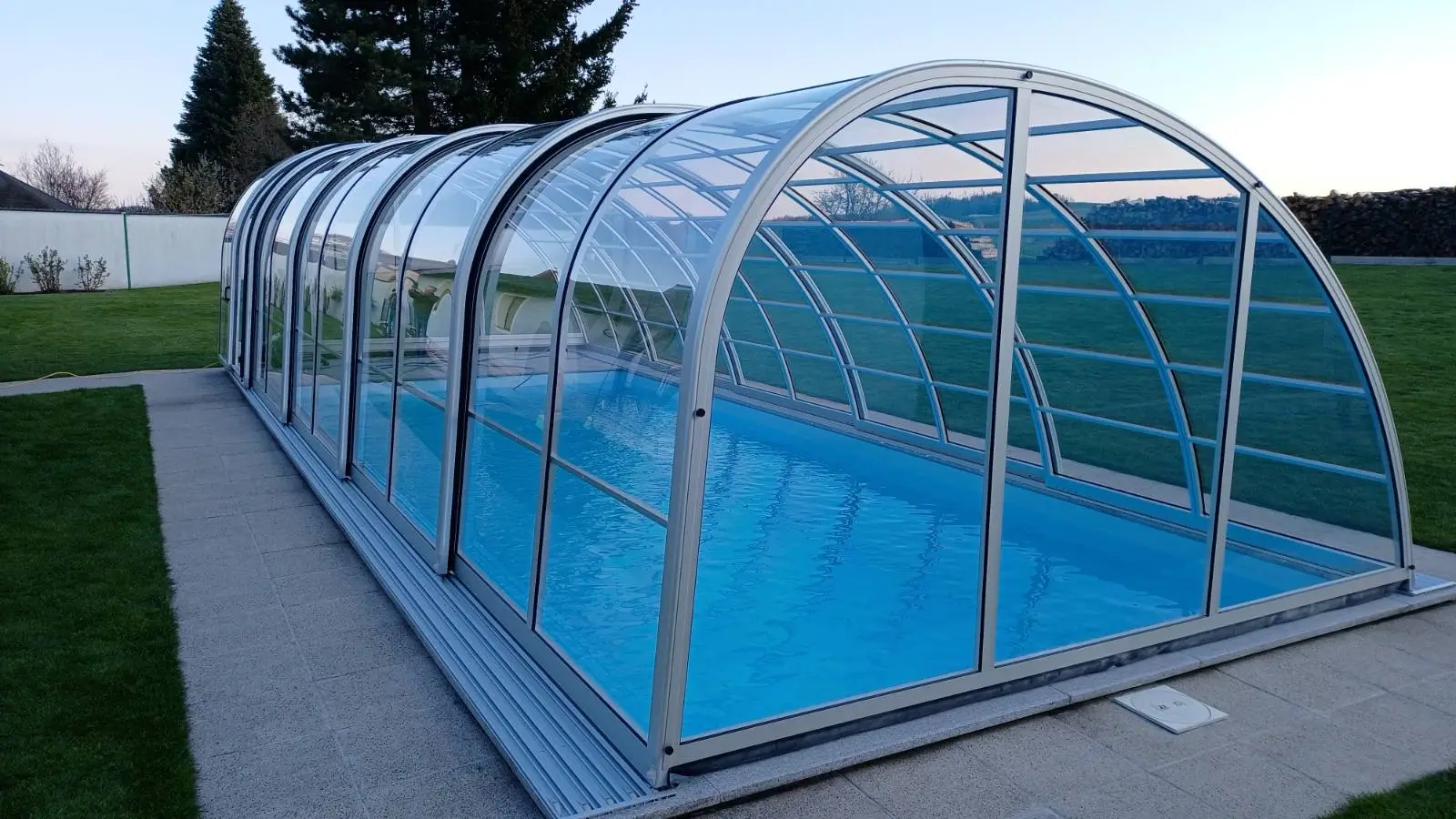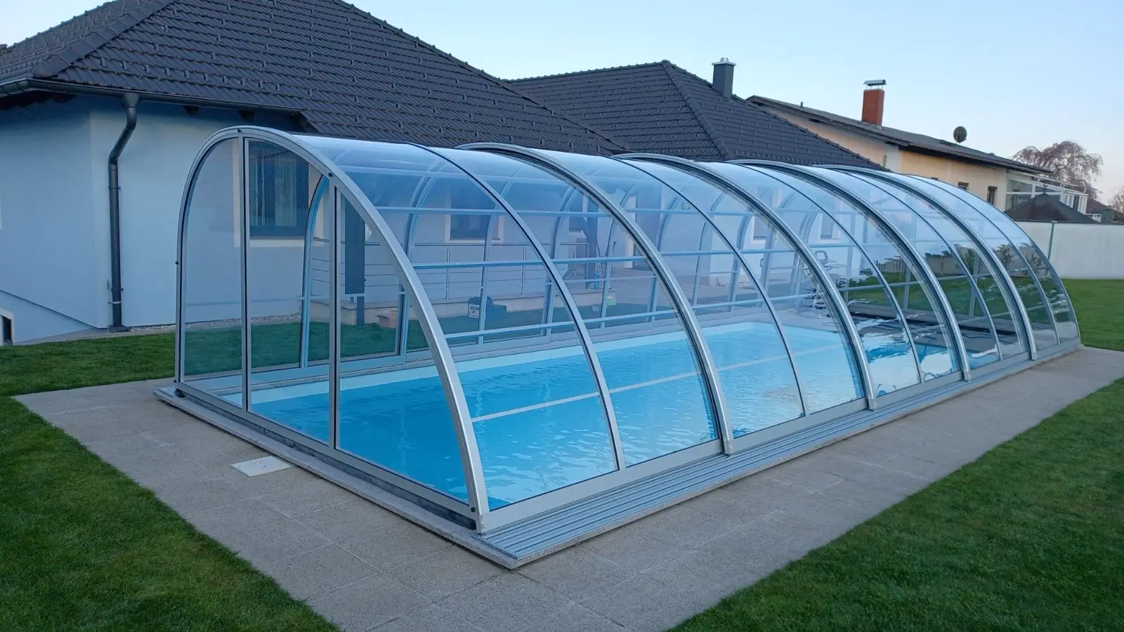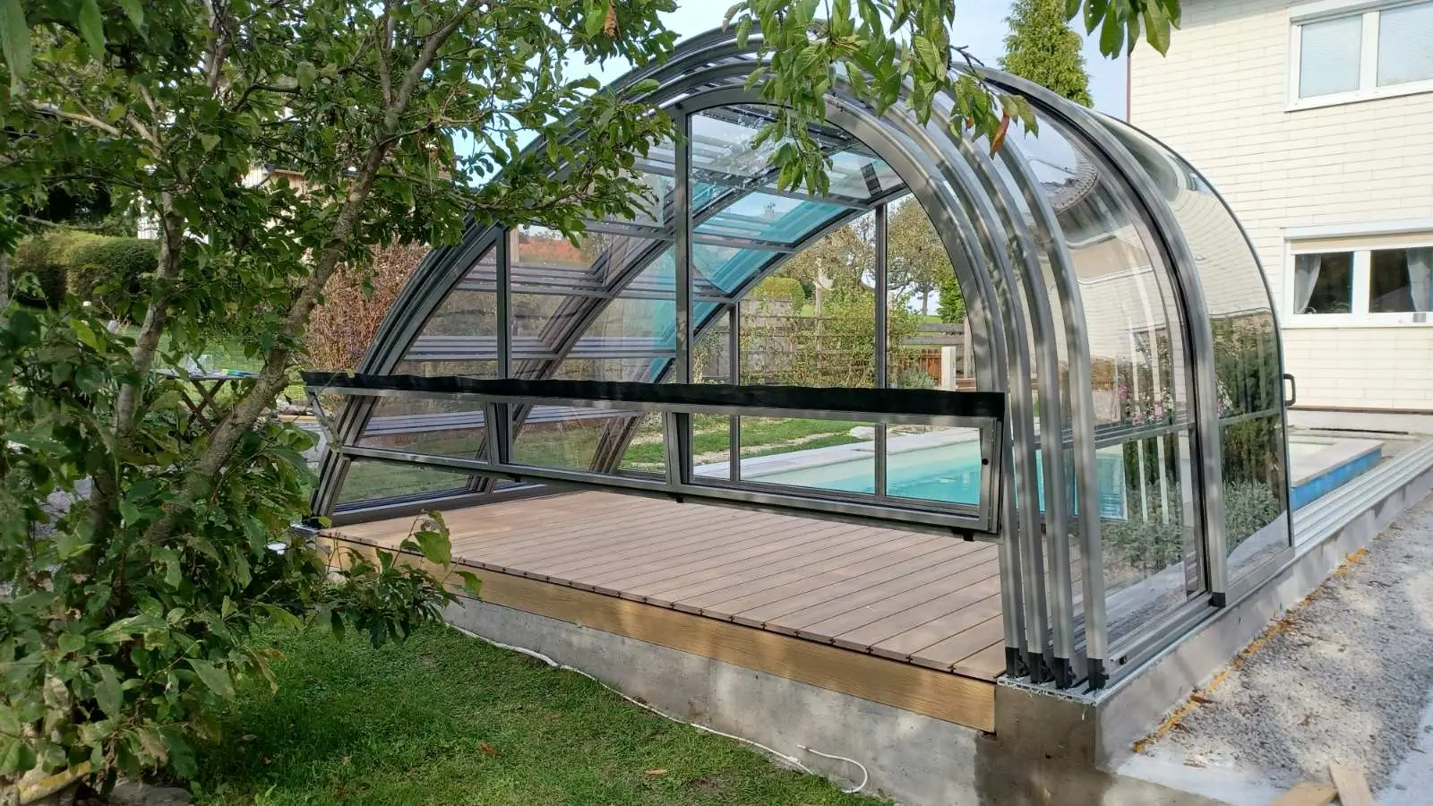 Az Oasis modell szakít a hagyományos szimmetriával, hogy egy merészebb, építészetileg izgalmasabb megoldást kínáljon a vízparti környezetben. Az egyik oldalon hangsúlyosabb, a másikon lágyan alábukó vonalak játéka nemcsak vizuális bravúr, hanem egyfajta funkcionális művészet, amely nyitottabbá és szellősebbé teszi az udvar összképét. Ez a kialakítás a kortárs tájépítészet elveit követi, ahol az üvegfelületek és a fémszerkezet fúziója egy transzparens, mégis határozott jelenléttel bíró pihenőhelyet hoz létre. A formai játékosság révén a fedés nem elrejti a medencét, hanem egyedi keretbe foglalja, miközben tiszteletben tartja a kert meglévő növényzetét és épített elemeit.
