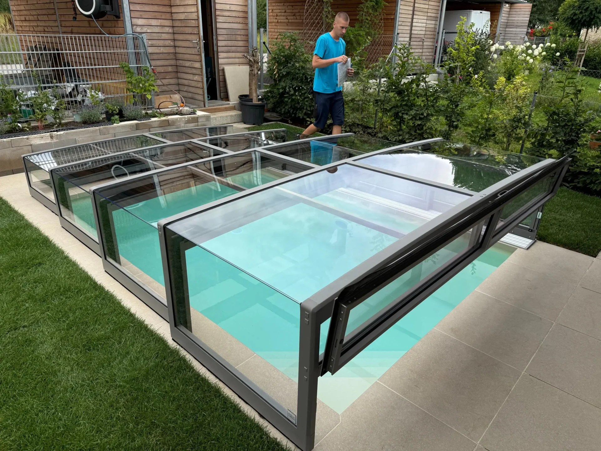 A tömör polikarbonát üvegezés olyan tiszta, hogy szinte észrevétlen marad a víz felett. A prémium, üvegszerű felületek nemcsak modern esztétikát kölcsönöznek a medencének, hanem lehetővé teszik, hogy a napfény minden szögéből akadálytalanul ragyogja be a vízfelületet, megteremtve a luxus és a szabadság tökéletes kombinációját a kertben.