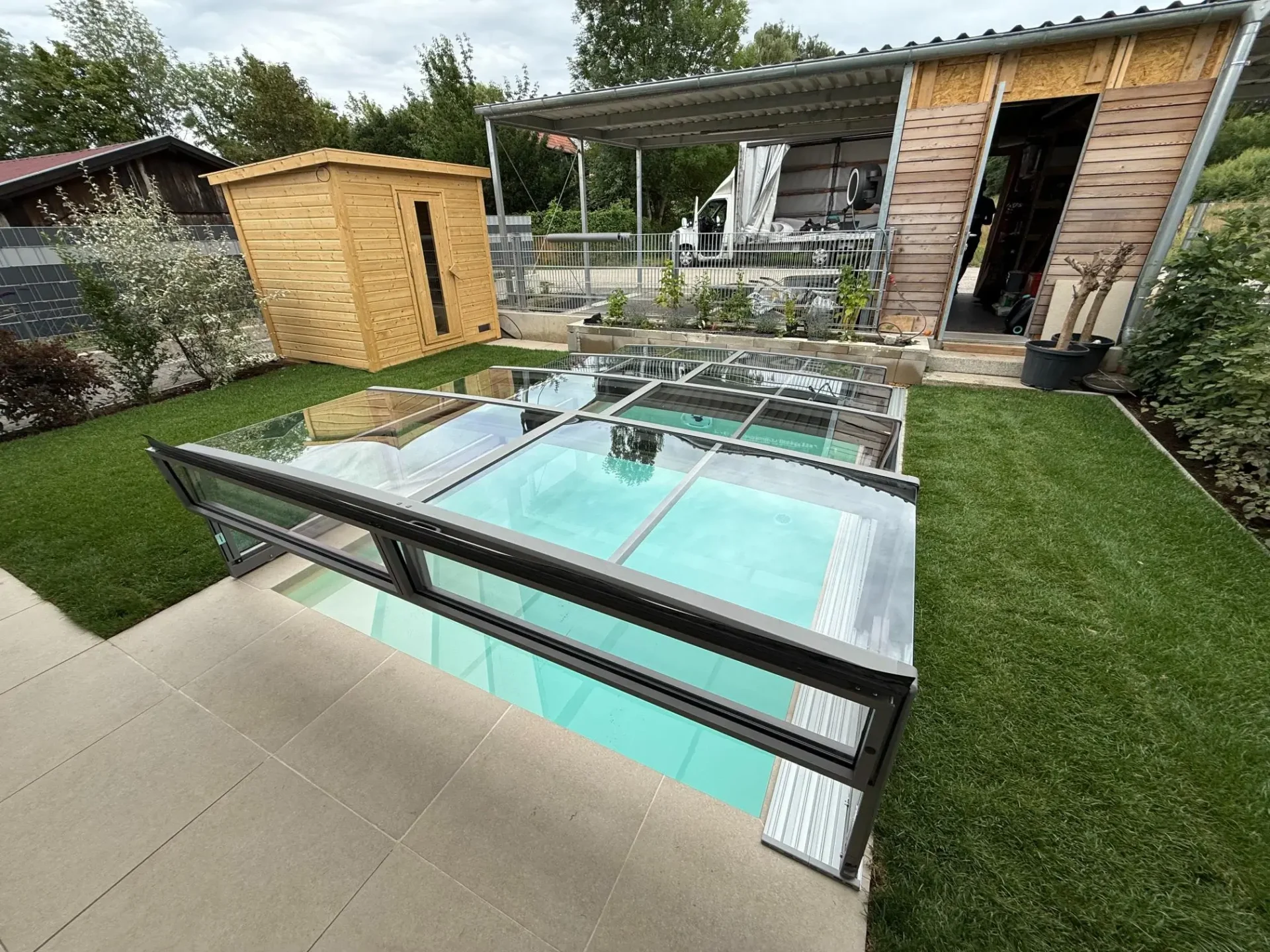 A tervezés során a legfőbb szempont a lakókörnyezet és a funkció közötti vizuális egyensúly megteremtése volt. A szögletes, minimál profilrendszer nem töri meg a kert vonalvezetését, hanem elegáns kiegészítőként emeli az ingatlan esztétikai értékét. Ez a megoldás a medencefedést prémium építészeti elemként kezeli, amely évtizedeken át harmonizál a modern otthonok stílusával.