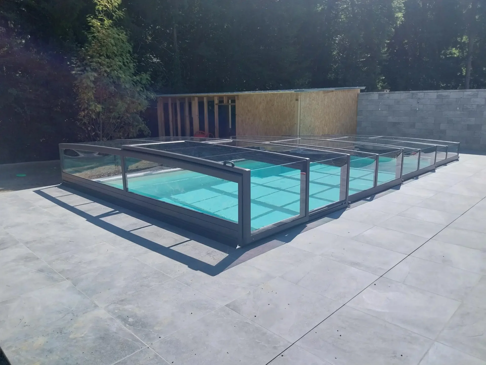 Szerkezeti integritását a megerősített alumínium profilok és a 4 mm vastag, tömör polikarbonát panelek szimbiózisa adja. Ez a technológia a valódi üveg kristálytiszta eleganciáját ötvözi a modern kompozitok elnyűhetetlenségével, így a szerkezet ellenáll a szélsőséges szélterhelésnek és a jégverésnek is. A kétoldali UV-védelem garantálja a panelek évtizedes fényáteresztő képességét, miközben az intelligens anyaghasználat passzív módon, a napenergiát kihasználva fűti a medence vizét.