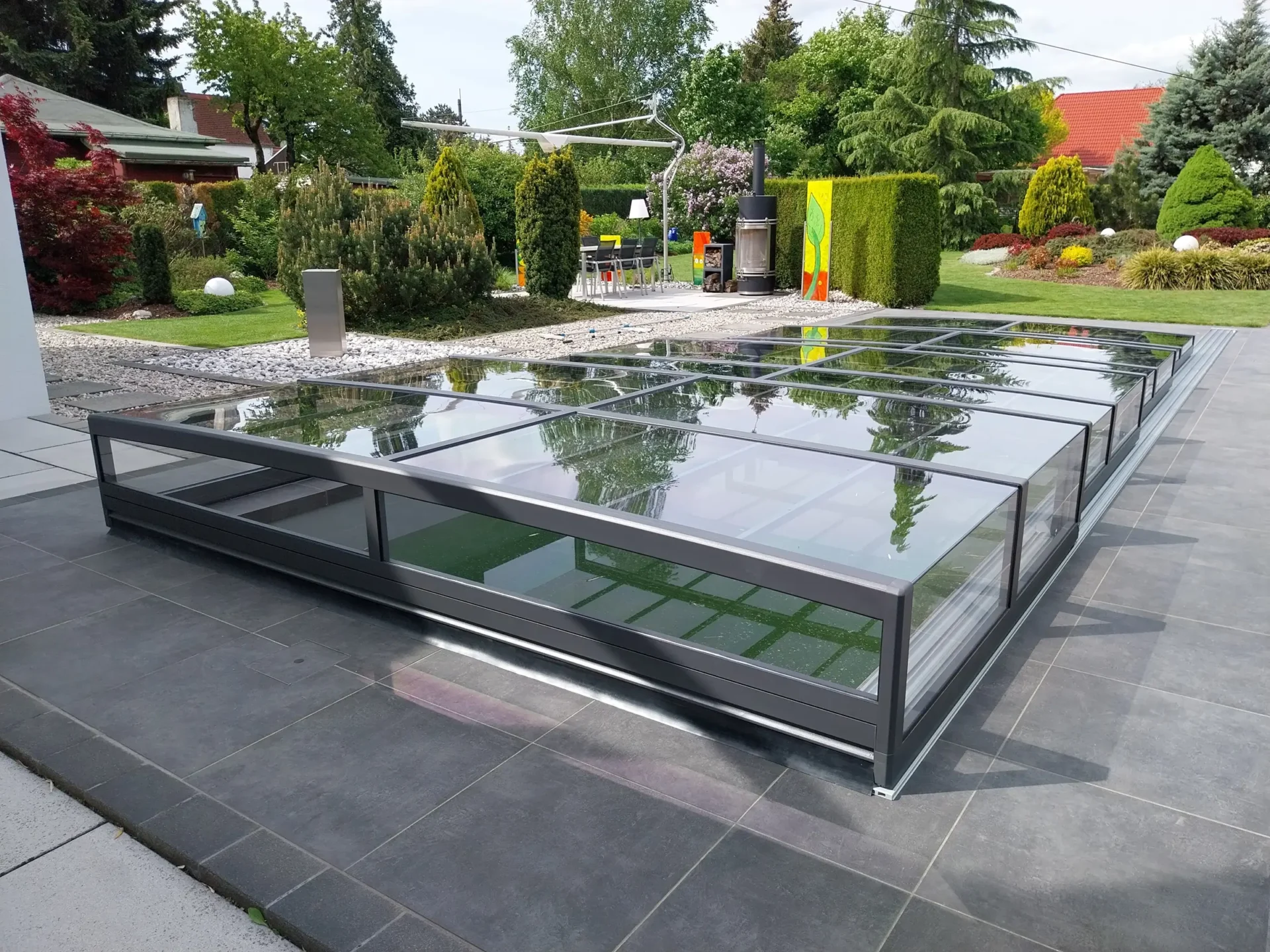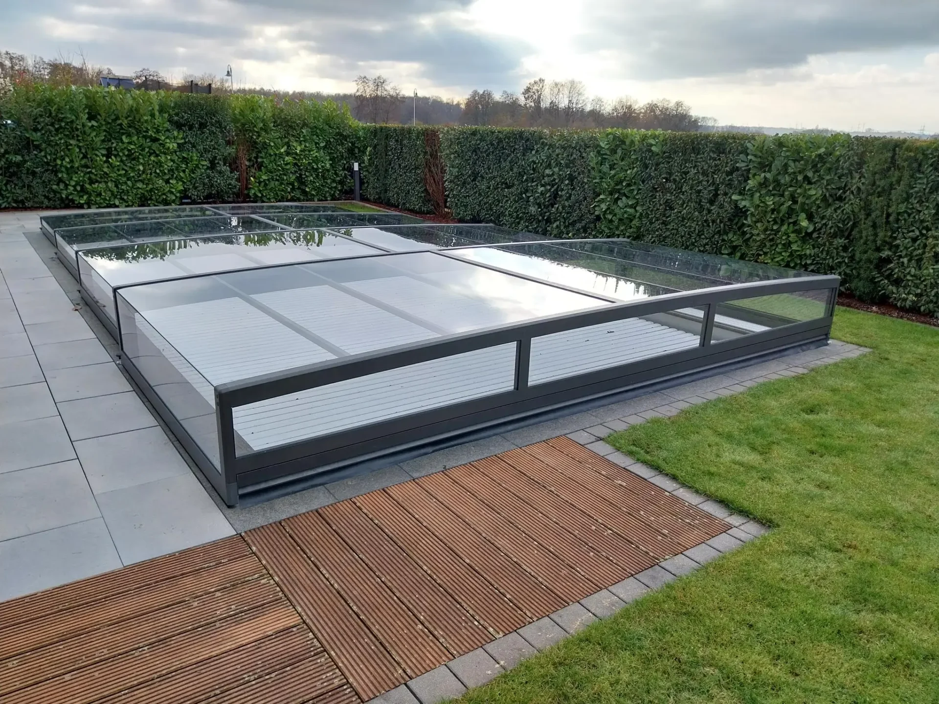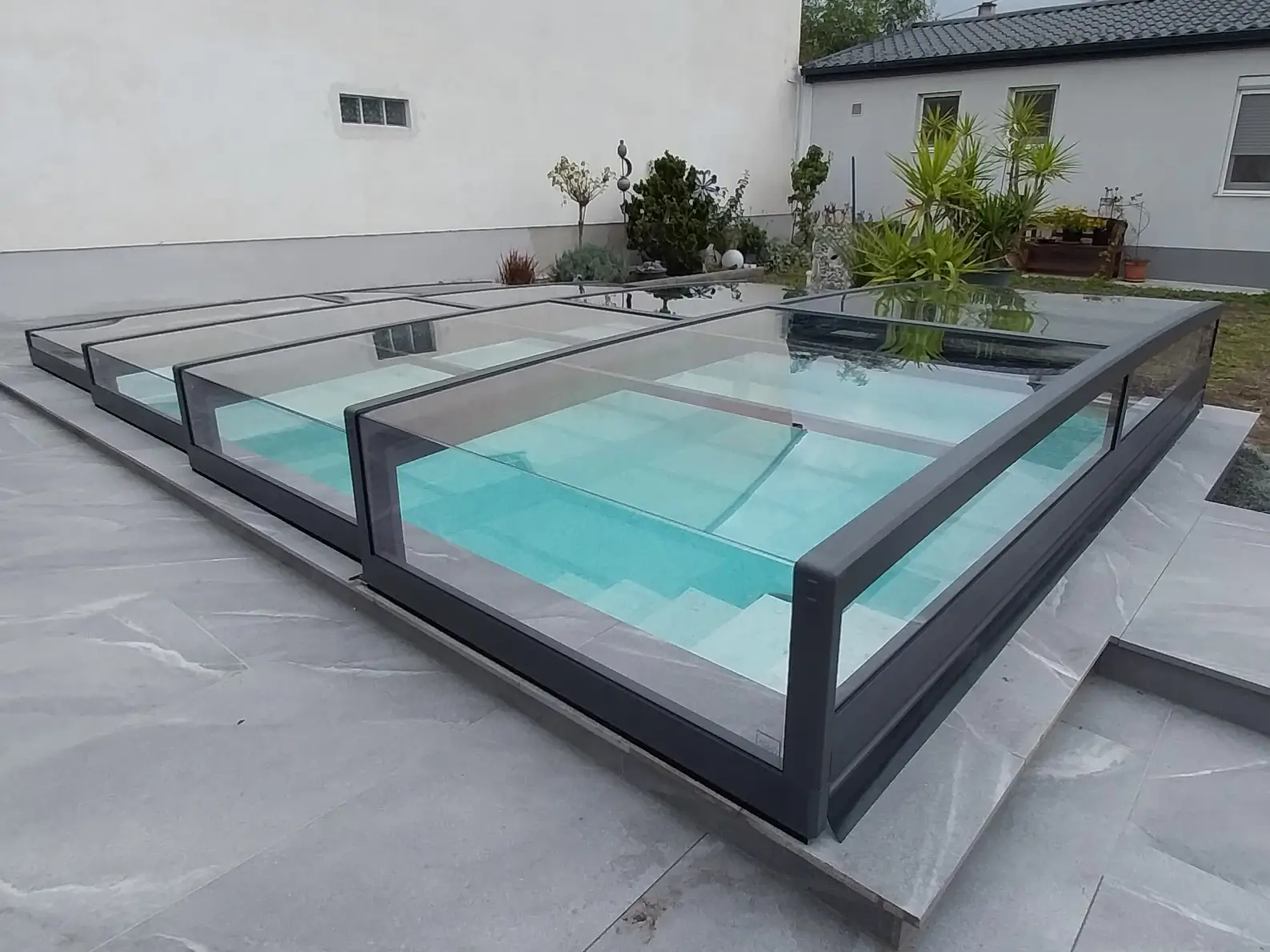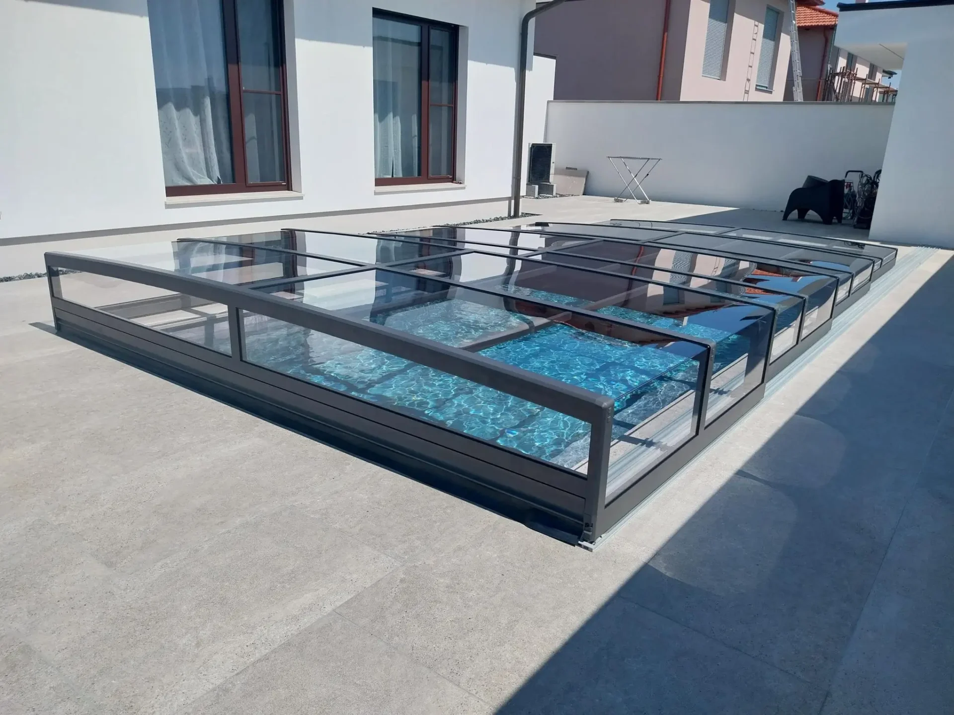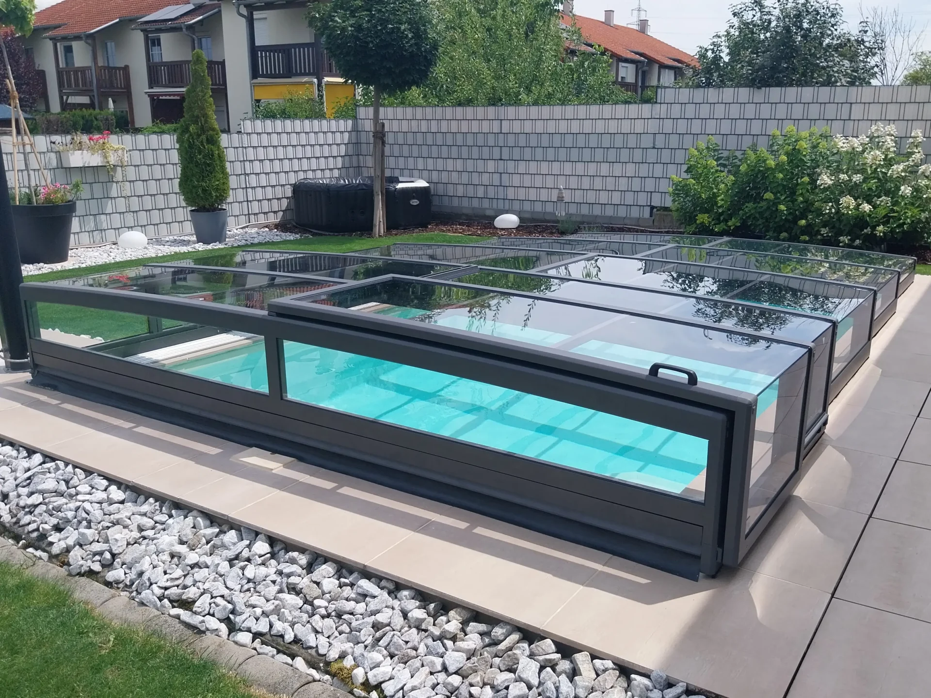 A Prisma használata a vizuális szabadságról szól: zárt állapotban is azt az érzetet kelti, mintha semmi nem állna a víz és a szemlélő közé, így a víz csillogása mindvégig a kert központi eleme marad. A prémium futóműrendszer és a könnyített szegmensek révén a mozgatás csupán minimális fizikai érintést igényel, a medence nyitása vagy zárása pedig pillanatok alatt, észrevétlenül elvégezhető. Ez a típus nem kíván dominálni, csupán csendben szolgálja a biztonságot és a tisztaságot, megőrizve a környezet tágas és nyitott jellegét. Ezt a medencefedés típust azon tulajdonosoknak fejlesztettük ki, akik a kompromisszummentes, modern designt keresik, és fontos számukra, hogy a technikai védelem ne írja felül az otthonuk építészeti egységét.