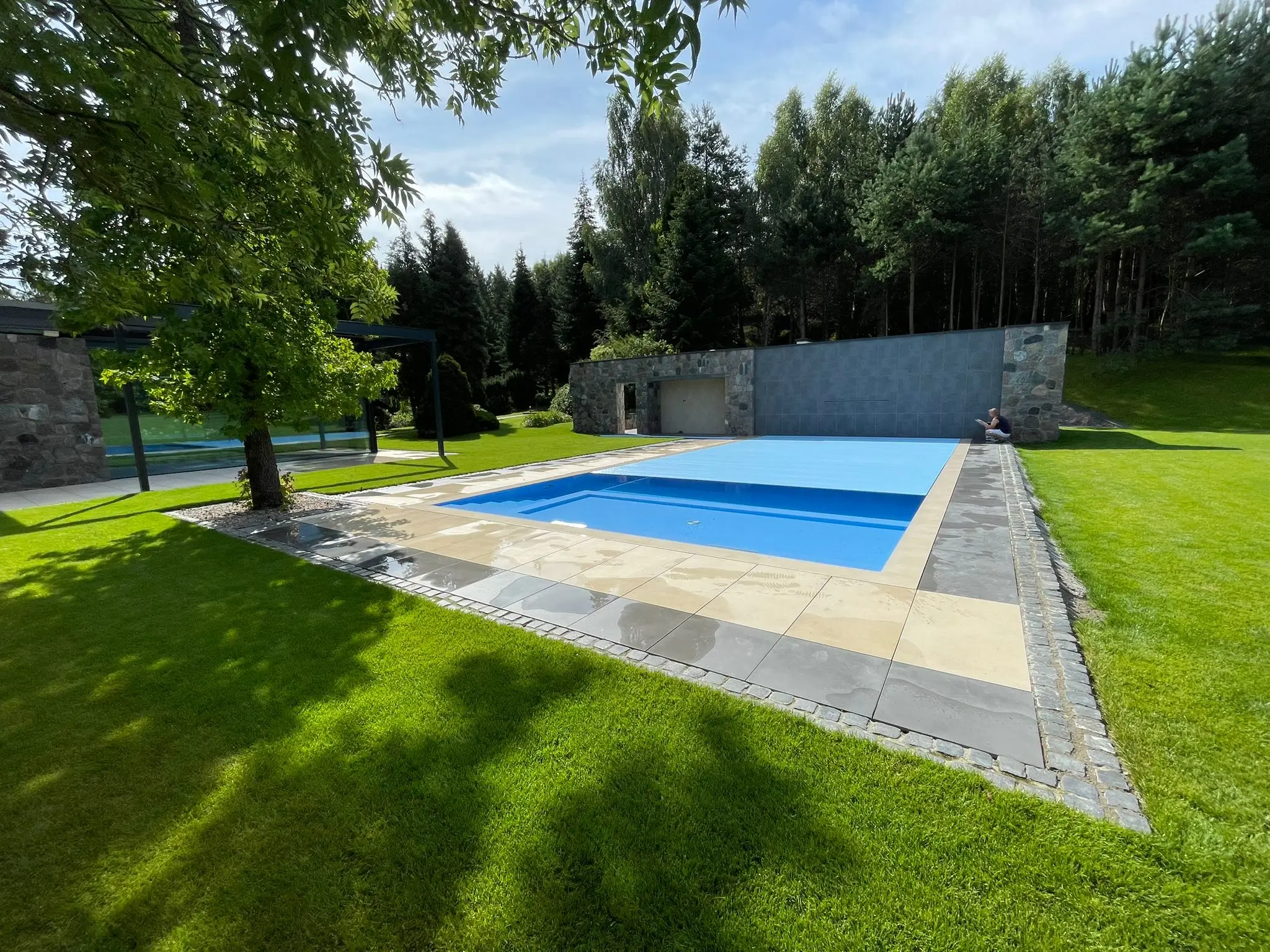 A burkolat alá süllyesztett, rejtett technológia megőrzi a kert építészeti egységét, miközben láthatatlanul szolgálja a medence fizikai védelmét és a család biztonságát.