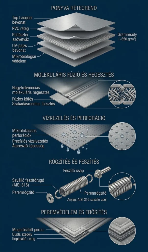A többrétegű PVC szövet (~650 g/m²) tökéletes egyensúlyt nyújt a szerkezeti merevség és a könnyű, napi szintű kezelhetőség között